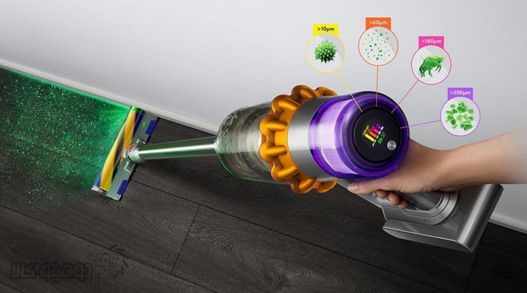 فیلتر بهکار رفته در Dyson V15 از نوع HEPA بوده و توانایی جذب 99.99 درصد ذرات میکروسکوپی را دارد. این قابلیت برای افرادی که حساسیت یا آسم دارند بسیار مفید است.